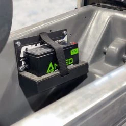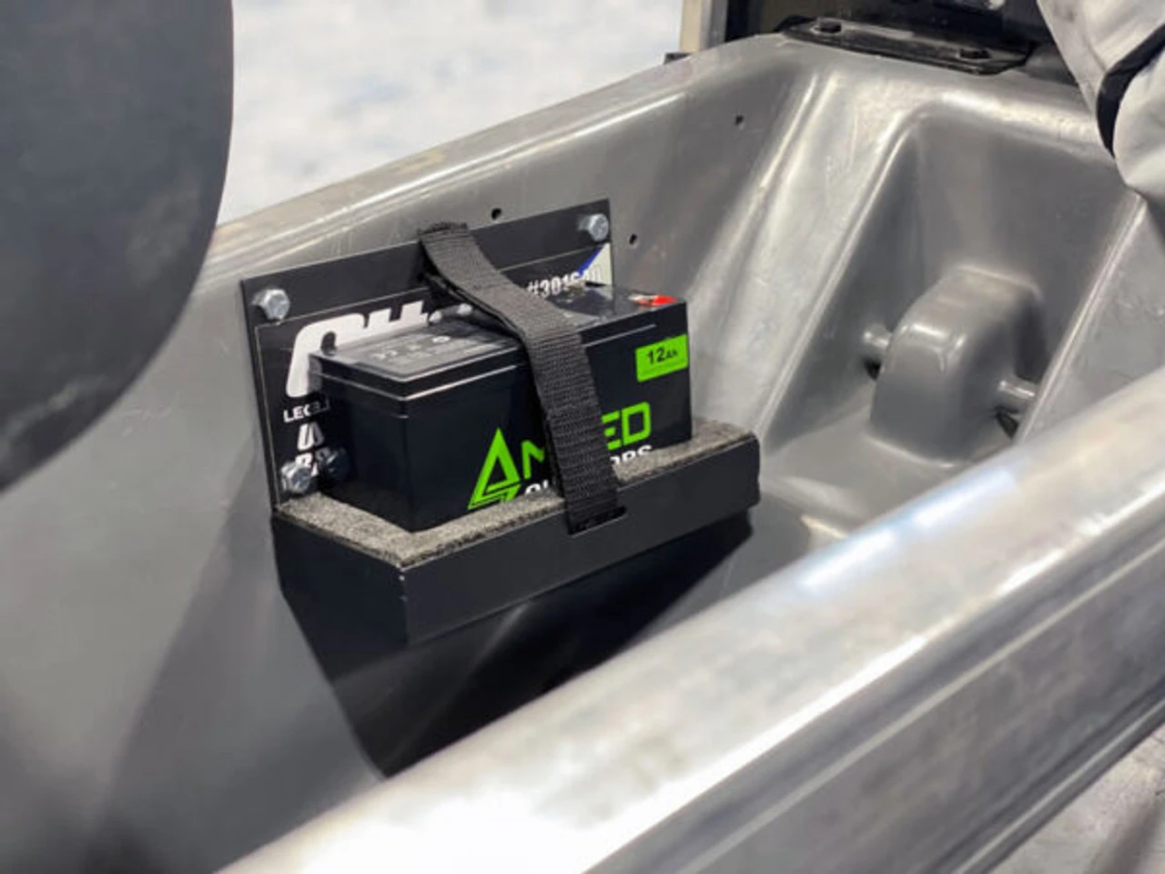 Designed to fit all sled style shelters. Securely holds one standard 12v battery. Mounts to the interior of sled.
